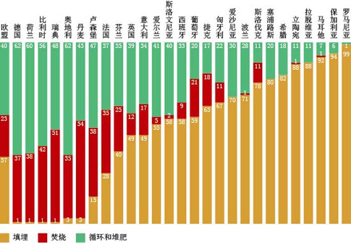 2011年歐盟27國城市垃圾處理方法比較 來源:歐洲統計局